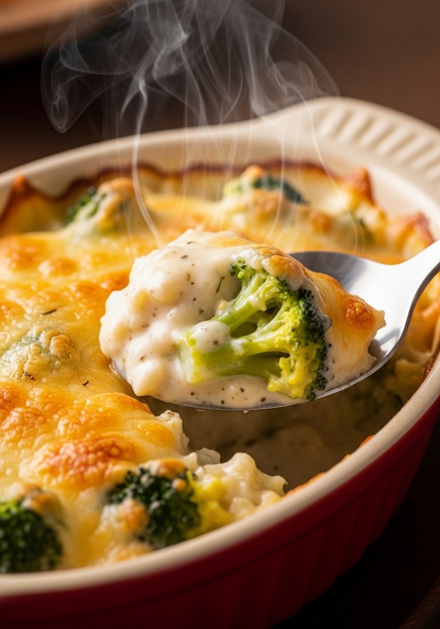- Assemble Casserole: Combine steamed broccoli and cream sauce in a baking dish, stir in cheddar and season.