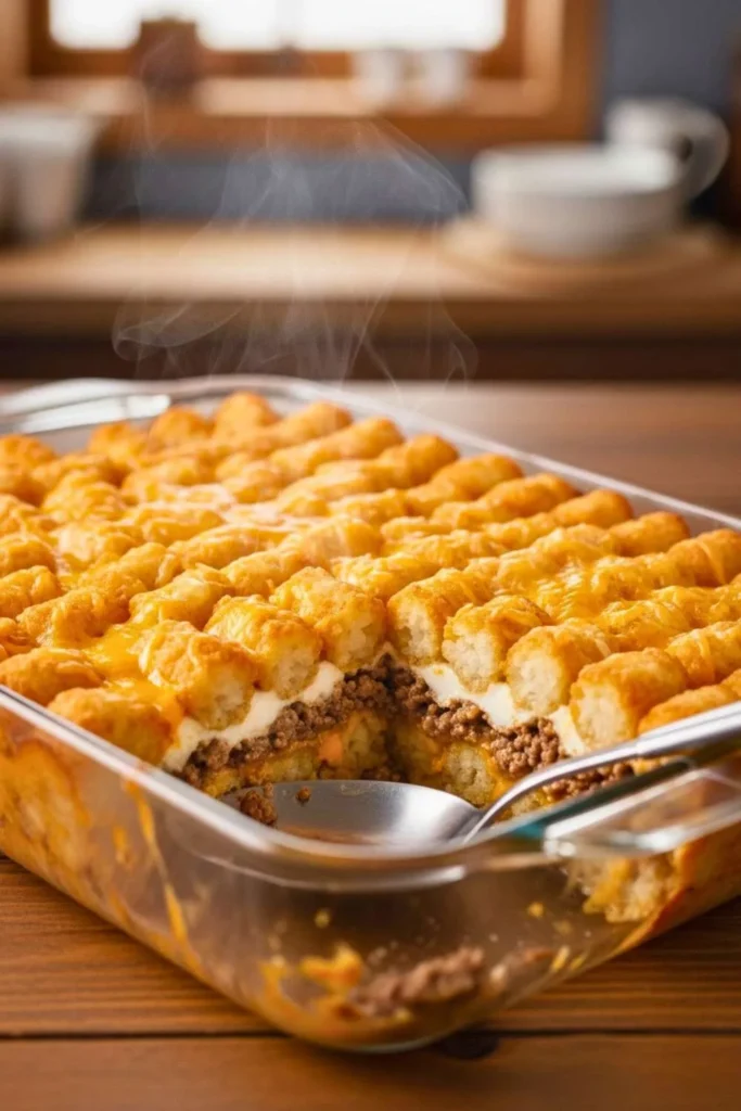 This tater tot casserole is a rich, flavorful dish featuring seasoned ground beef, creamy sauce, and a crunchy tater tot topping.