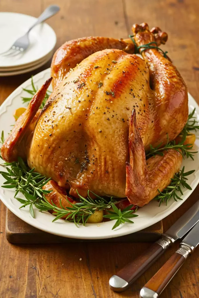 The turkey is ready when a meat thermometer in the thickest part of the thigh reads 165°F (74°C). Let the turkey sit for at least 20–30 minutes before carving so the juices stay inside the meat.