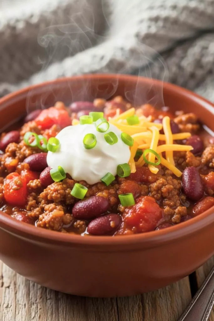 Brown the beef in a large pot, then add onions and garlic until softened. Stir in tomato paste, diced tomatoes, and seasonings. Add beans and simmer for 30–40 minutes. Serve hot with shredded cheese and a side of cornbread.
